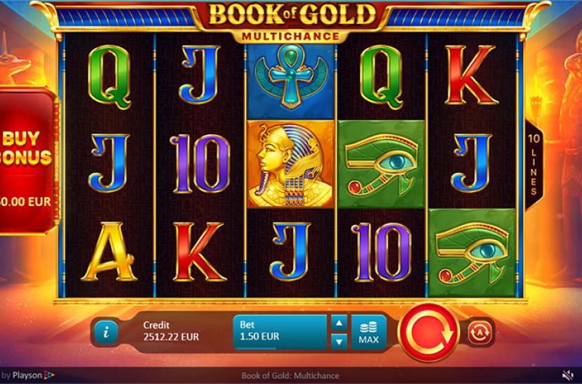 Egyptian bundle of Playson is expanded with a new and mysterious game - “Book of Gold: Multichance”. The slot has 3x5 grid with 10 pay lines and Scatter symbol drawn as a celestial golden book.
