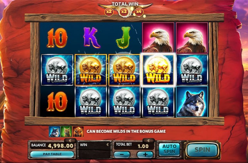 Embárcate en una aventura por las grandes llanuras con "Grand Bison", una tragaperras online 5×3 con 25 líneas de pago. El WILD multiplicador aumenta tus ganancias, mientras los SCATTER activan Free Spins donde los animales se transforman en WILDs. Siente la fuerza del bisonte y descubre grandes premios.