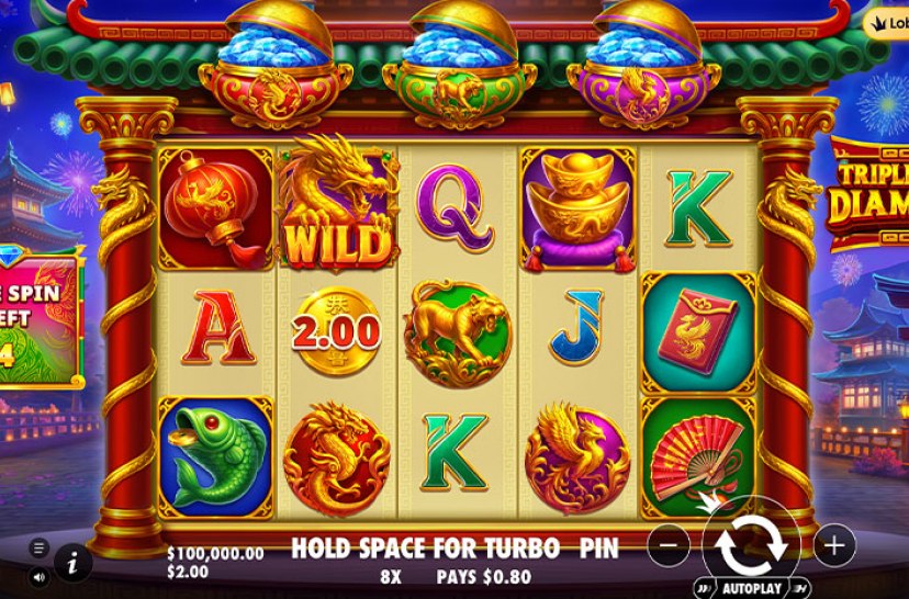 “Triple Pot Diamond” de Pragmatic Play es una dinámica tragaperras con monedas doradas que pueden alcanzar valores de hasta 500x. Estas aparecen en los rodillos y se recogen cuando un símbolo collect aterriza en el último, sumando todas las ganancias en un solo pago.