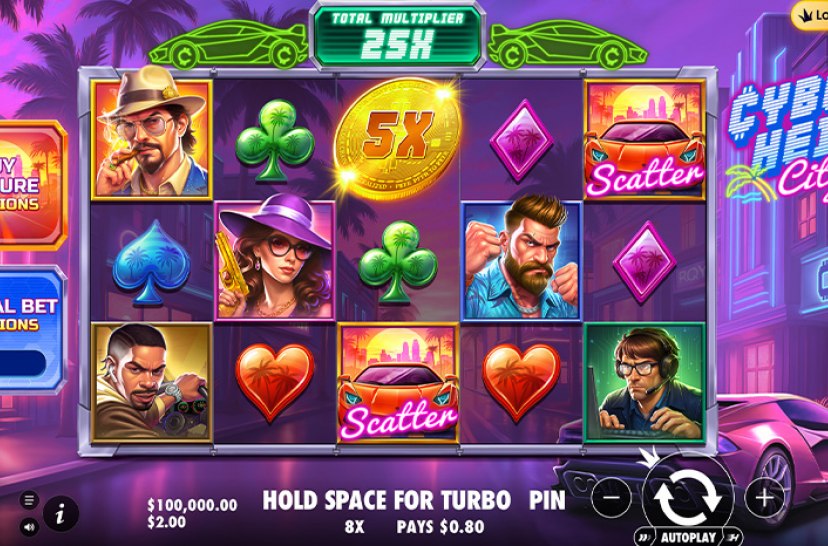 Domina las calles en "Cyberheist City", una tragaperras pays-anywhere 5×3 de estilo futurista. Los símbolos dorados se convierten en Wilds y cada cascada aumenta el multiplicador +1x, elevando la tensión y los premios.