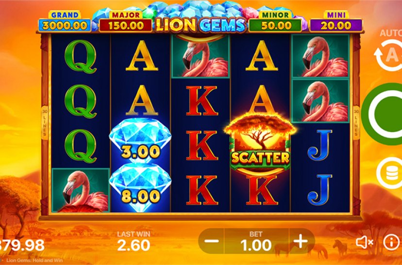 El 5x4 Lion Gems: Hold and Win es emocionante y lleno de aventuras, con animales como héroes de 30 líneas de pago. El símbolo salvaje activa las tiradas gratuitas y el juego de bonificación con la mecánica de mantener y girar. Además, ¡las gemas y los botes ofrecen una aventura inolvidable en la naturaleza!