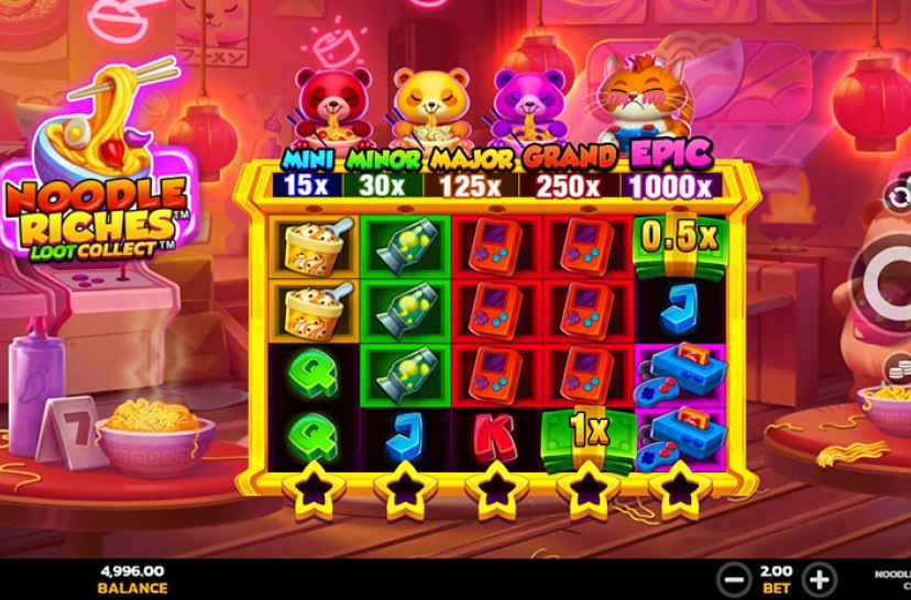 "Noodle Riches Loot Collect" presenta una aventura ambientada en un animado bar de ramen, donde pandas amantes de los fideos y un gato chef llenan los rodillos de personalidad. La mecánica Loot Collect™ añade progresión y momentos de recompensa, creando una experiencia colorida, divertida y con atractivo potencial de premio.