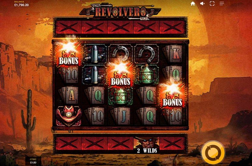 El reloj marca el mediodía en "Revolvero", una tragaperras del Salvaje Oeste donde cada giro es un duelo. El polvo se arremolina, las miradas se cruzan y la tensión aumenta. Una experiencia intensa y cinematográfica cargada de ambiente western.